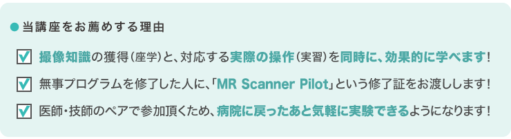 そこで、MR装置の基本的な操作を学んでいただき、その技能を元に自発的な実験と撮像の喜びを得られる場を提供したいと思い、この企画を考えました。ぜひ積極的にご参加いただければと思います。